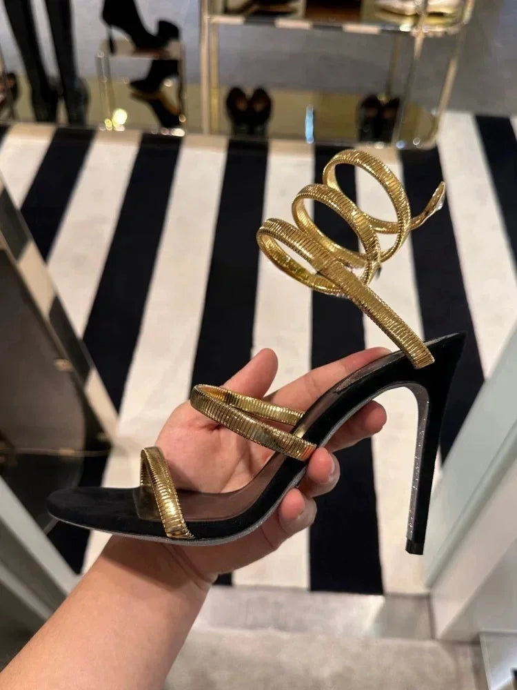 Salto Alto com tira no tornozelo, biqueira aberta e faixa fina.
