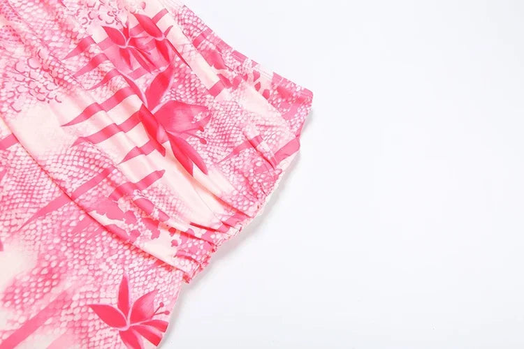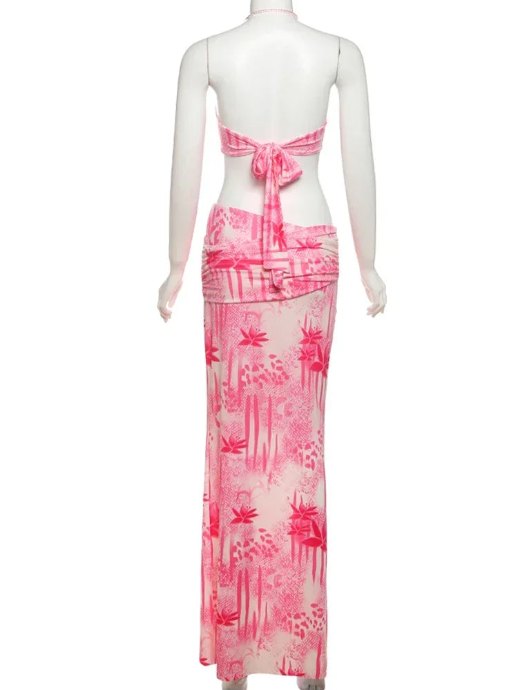 Conjunto de 2 Peças , Top Curto Halter com Decoração de Flores e Colar de Pérolas + Saia Justa
