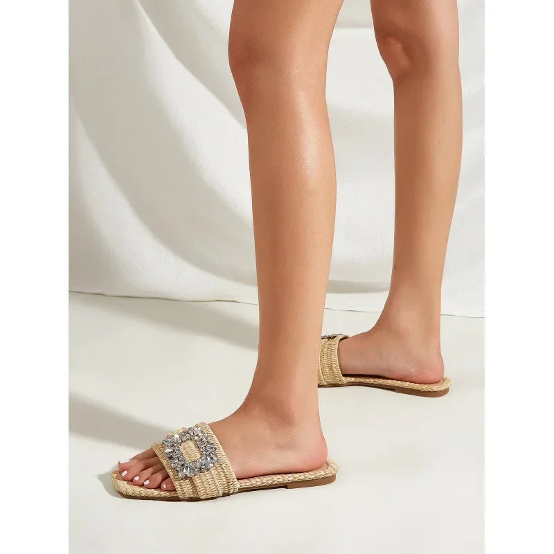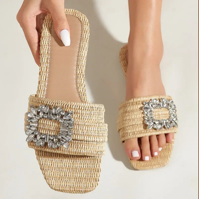 Chinelos de Bico Quadrado, Trançados em Palha, Salto Plano