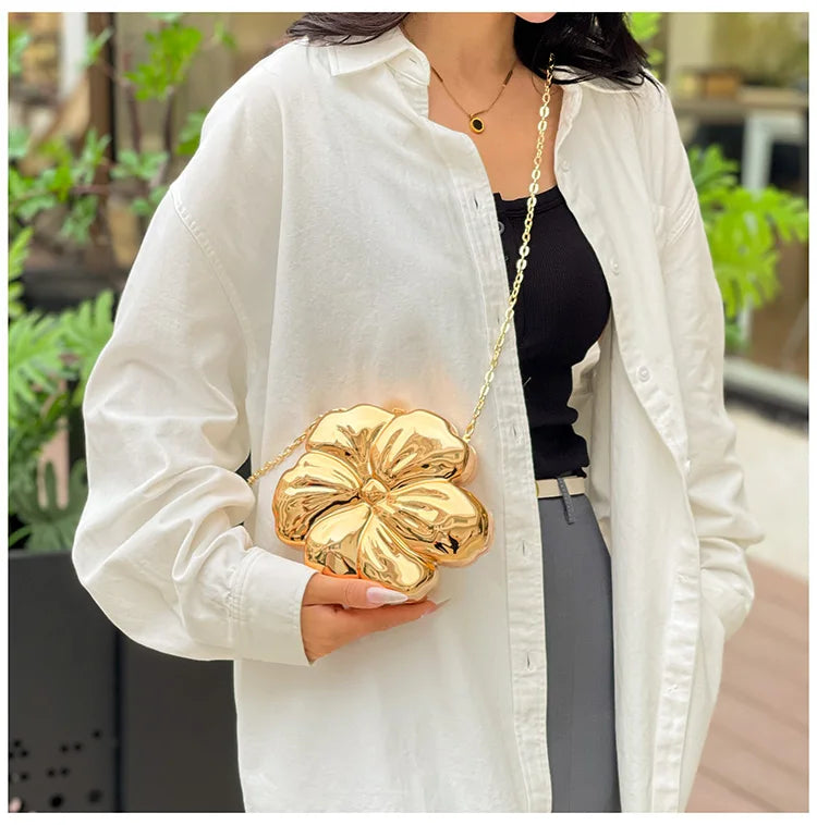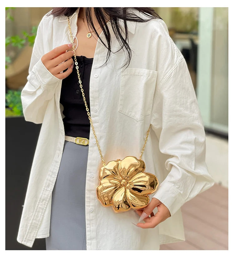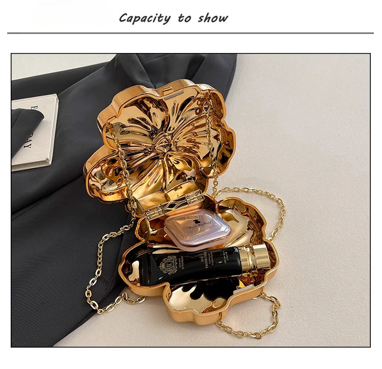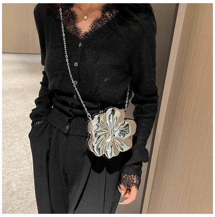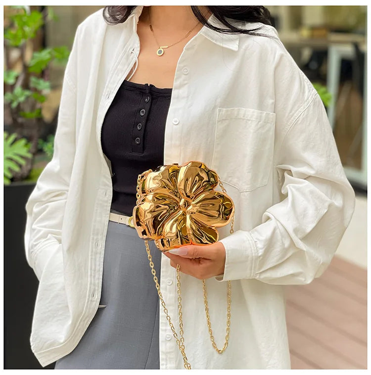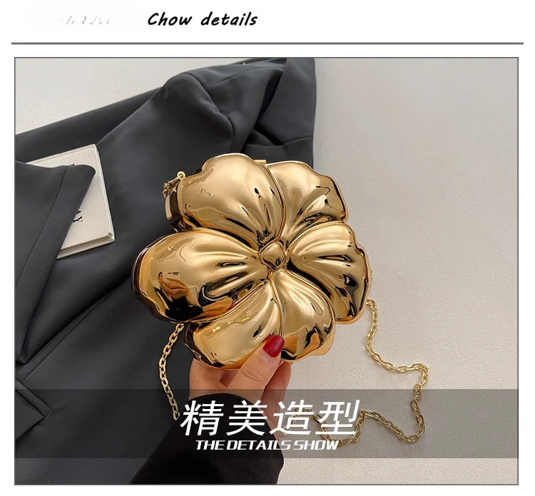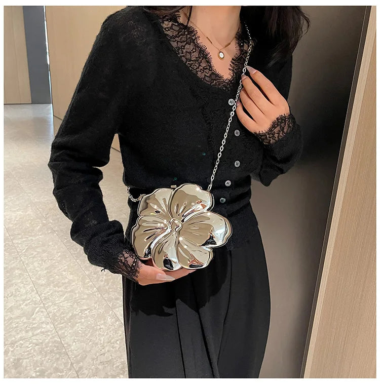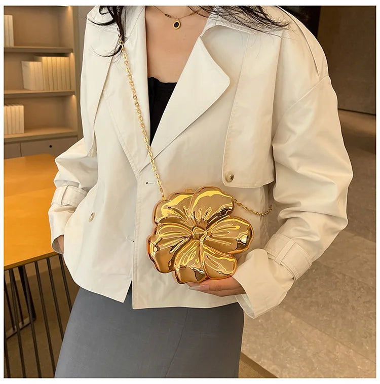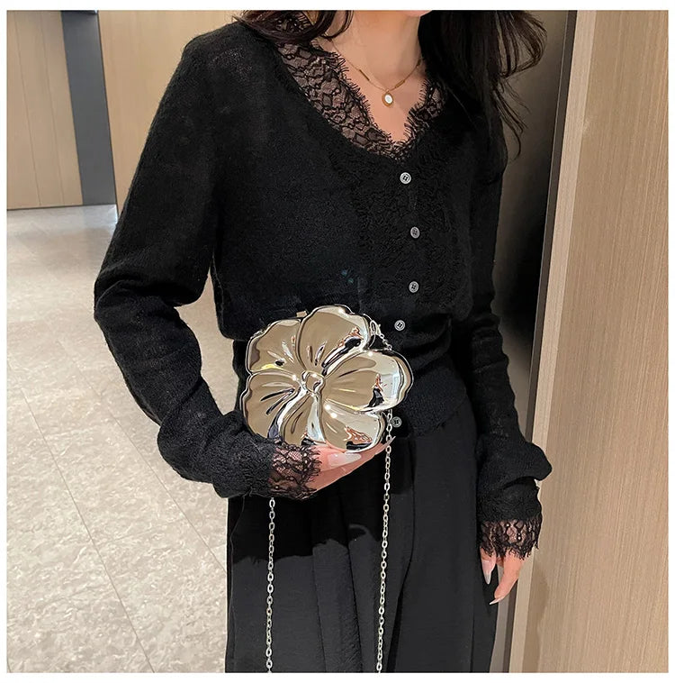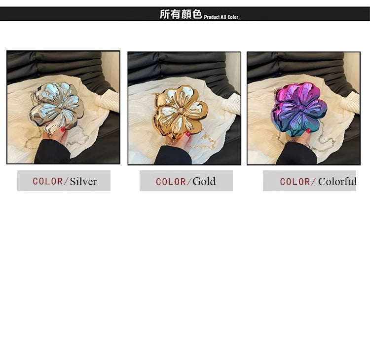 Descrição Bolsa de Ombro com Formato de Flor Tipo de Fecho: Fecho de encaixe (Hasp) Decoração: Correntes, Lantejoulas Dureza: Suave Produtos Químicos de Alta Preocupação: Nenhum Material do Forro: Poliéster Material Principal: Acrílico País de Origem: China Tipo de Padrão: Sólido / Liso